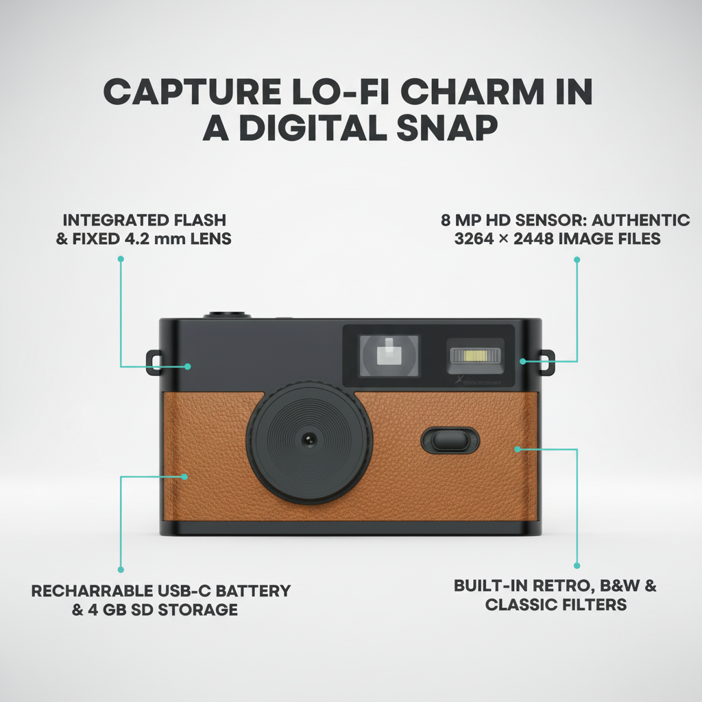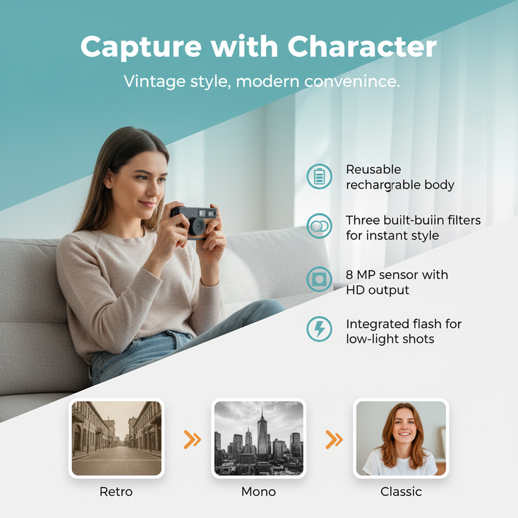 The TimeLens® Compact packs an 8 MP sensor, fixed 4.2 mm lens, integrated flash, and three fun filters—Retro, Mono, Classic—into one reusable rechargeable body. No more single-use film—just HD-quality digital files at 3264×2448 resolution, ready to share.